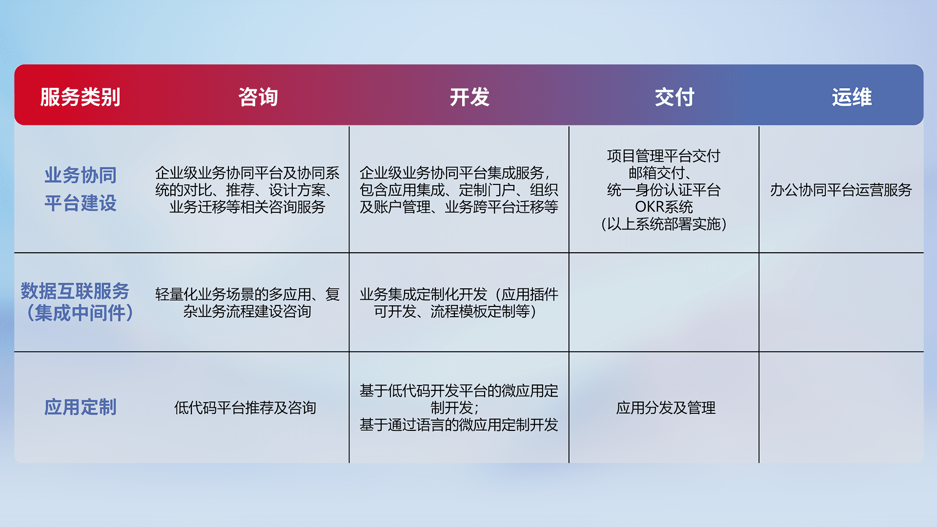 针对钉钉、、、企微、、、IDaas等平台级产品提供产品的规划、、、、方案、、交付、、定制化开发等服务,,,,实现如统一协同办公、、、智能客户服务、、、混合会议管理、、智能数据查询、、等业务场景,,实现数字化转型。。。