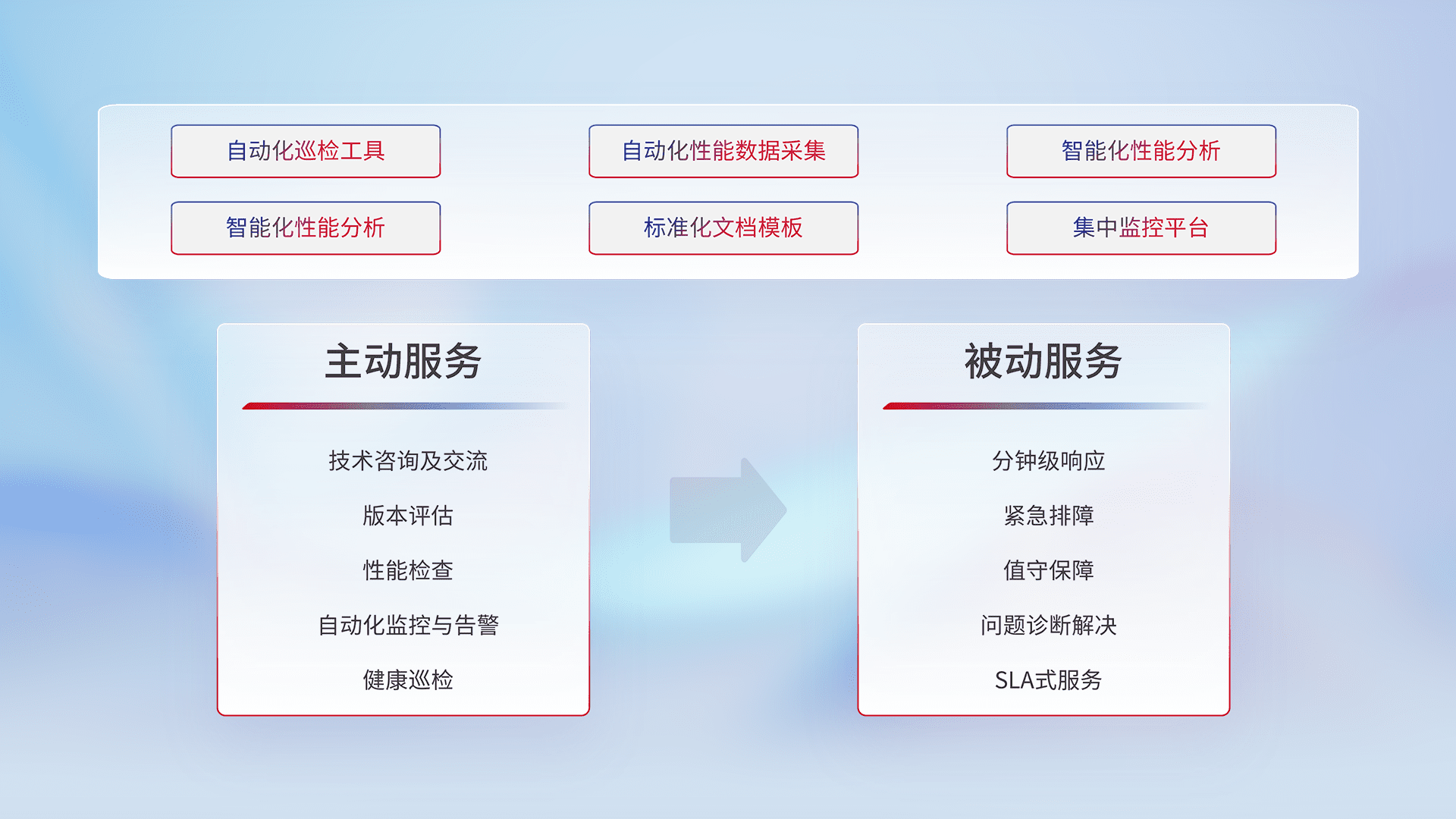 智能化工具和标准化文档,,,,保障服务质量,,,,提供主动服务(包含技术咨询、、、、版本评估、、性能检查、、自动化监控与告警、、、、健康巡检)和被动服务包含(分钟级响应、、、、紧急排障、、值守保障、、问题诊断解决、、、SLA服务)。。。