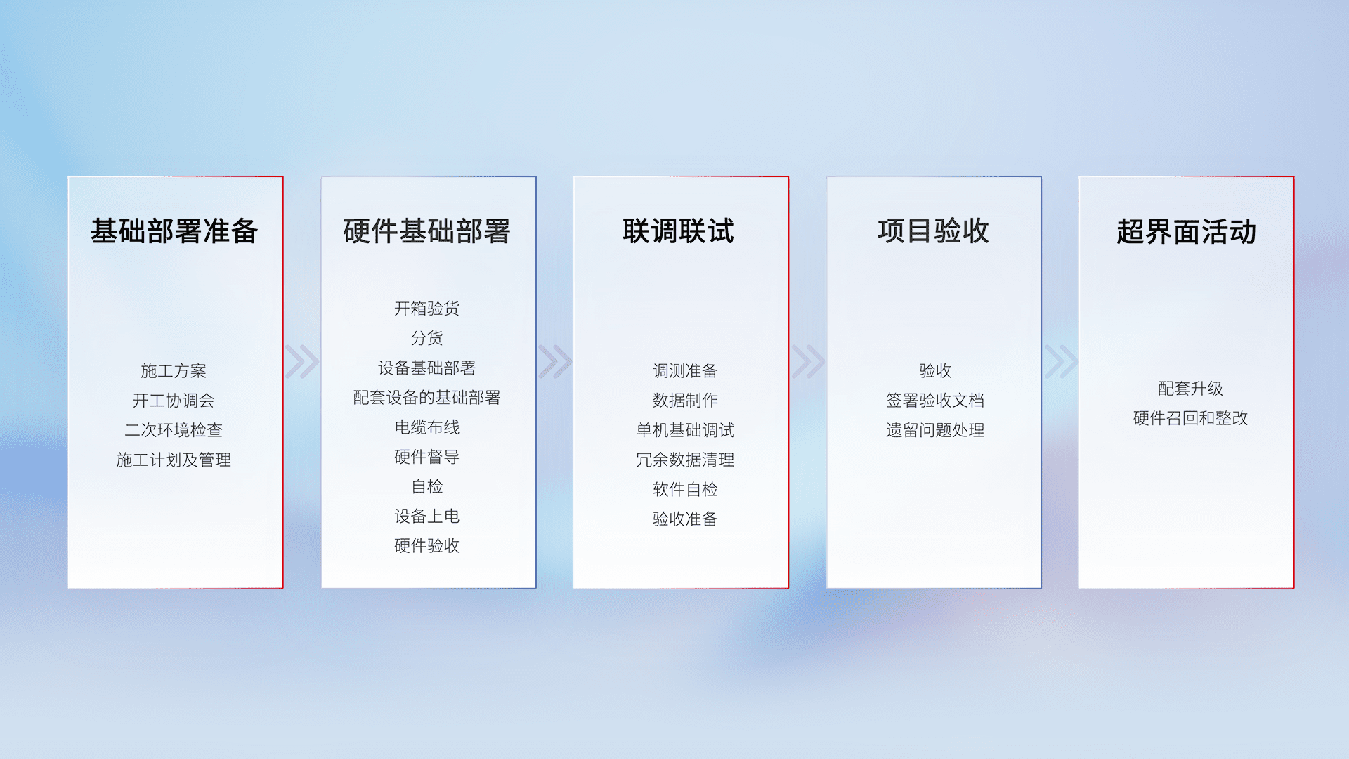 从基础部署准备、、、、硬件基础部署、、、、联调联试、、、项目验收、、、、越界面活动的全过程可追溯,,保证施工质量和进度。。。